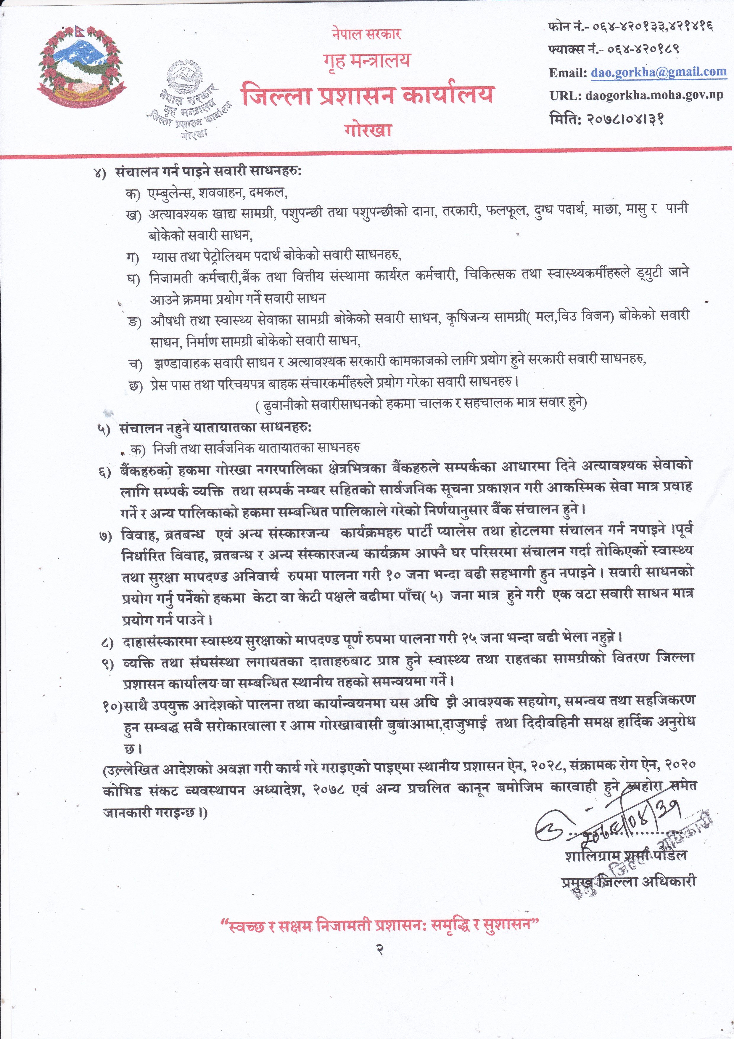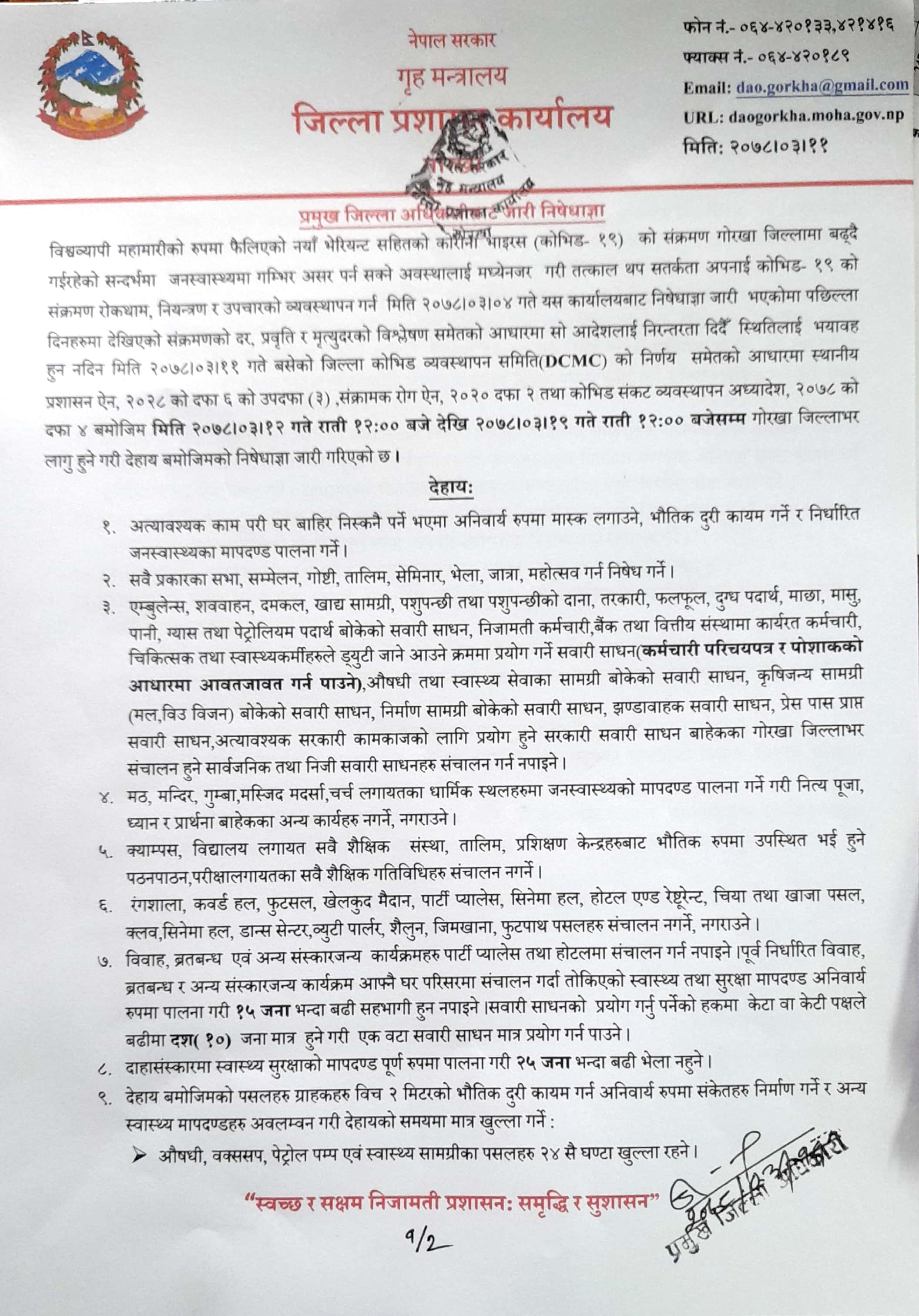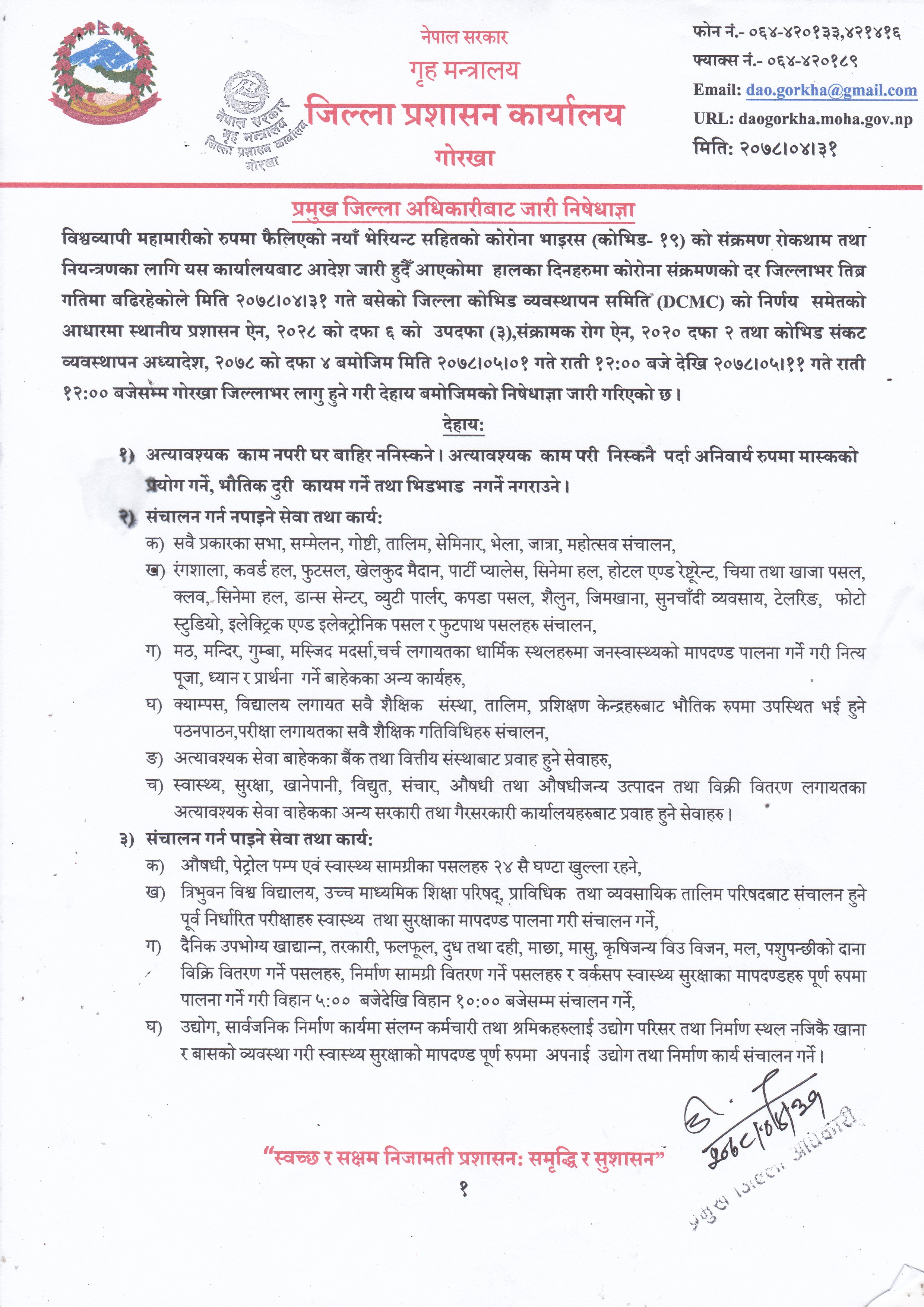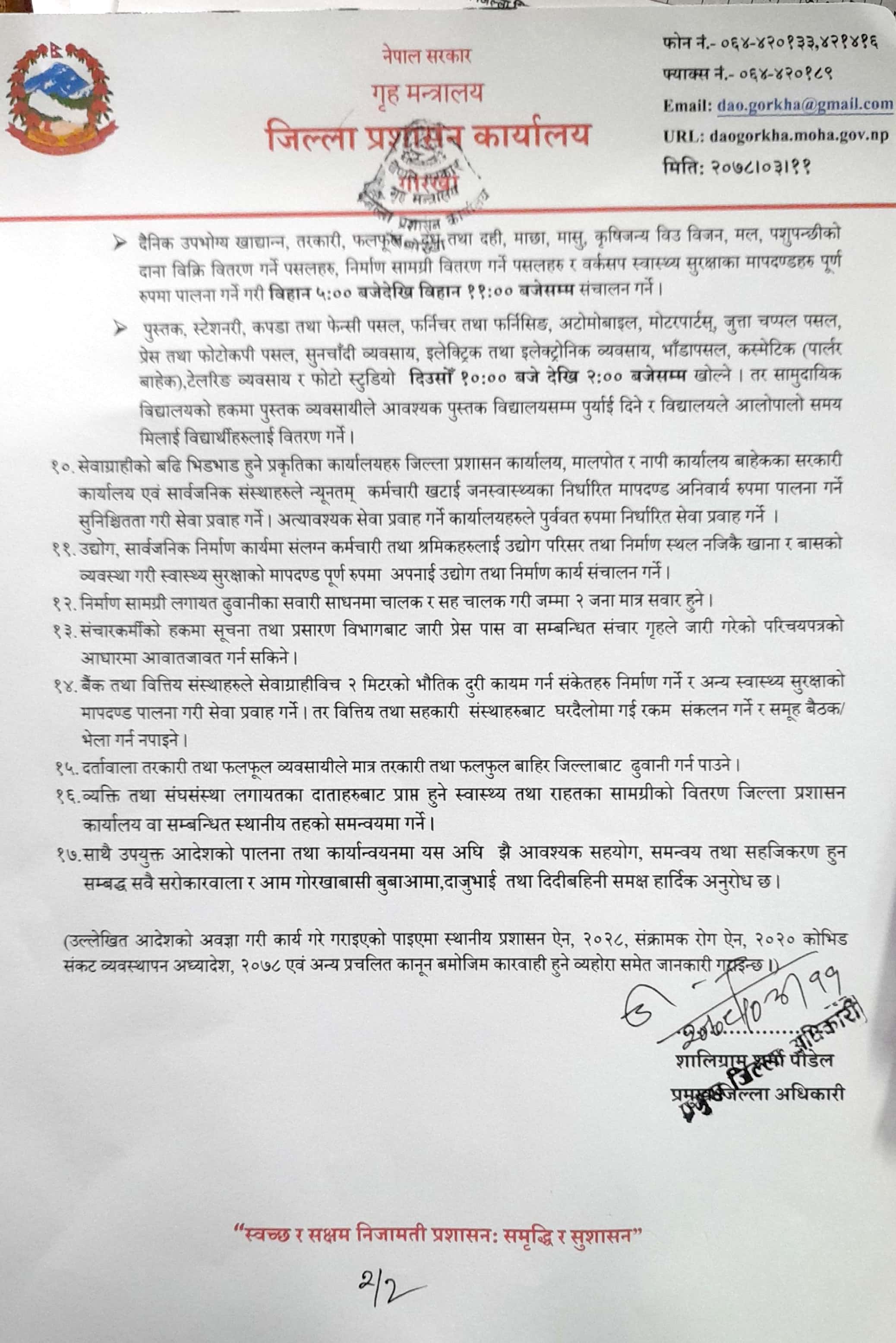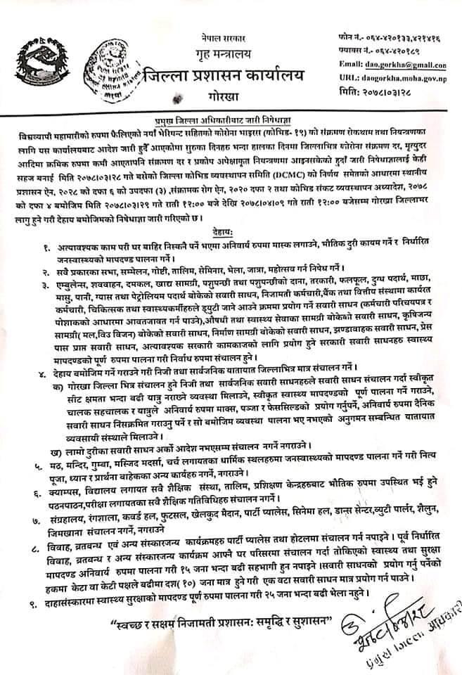 गोरखाको प्रमुख जिल्ला अधिकारीबाट जारी आदेश