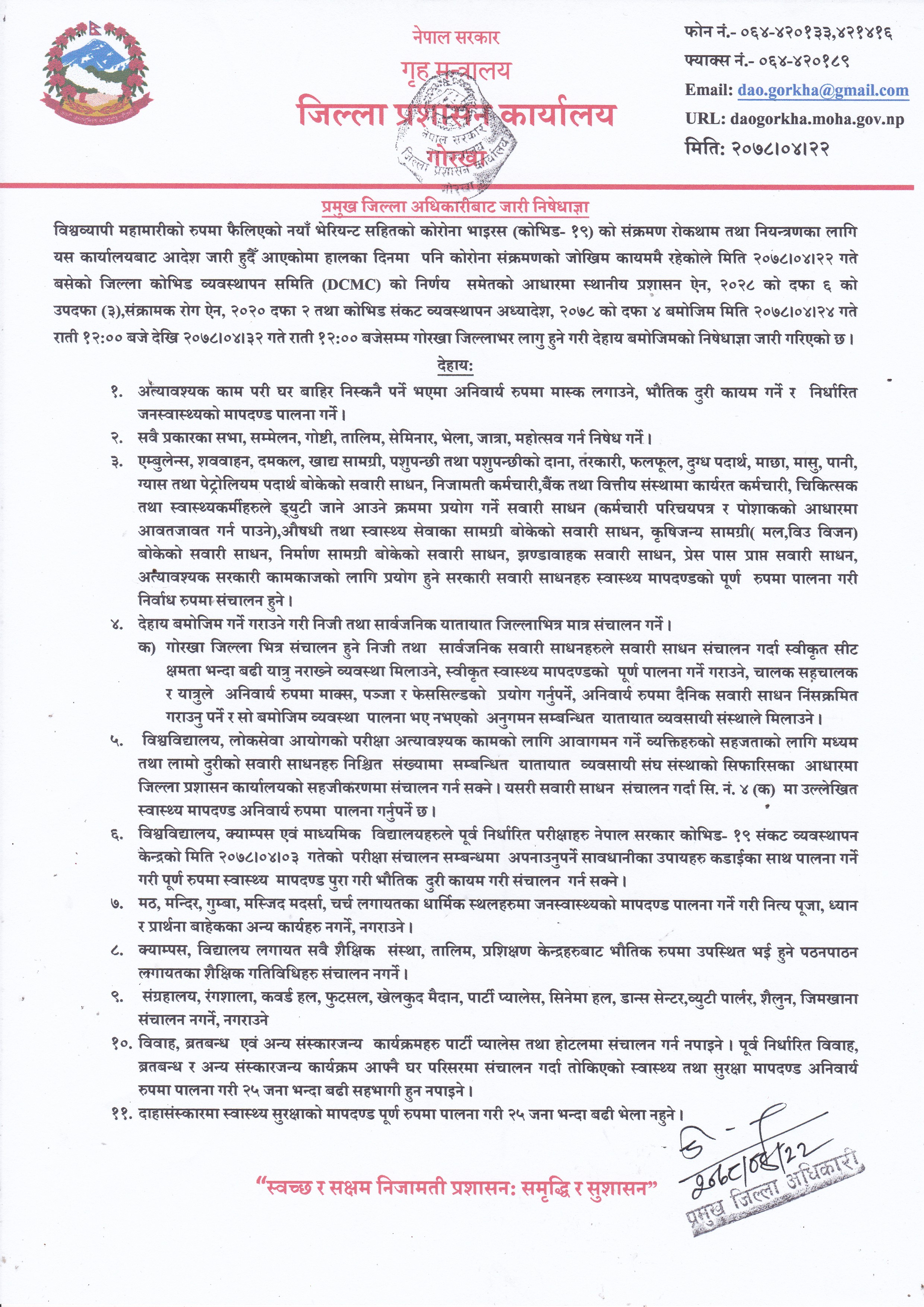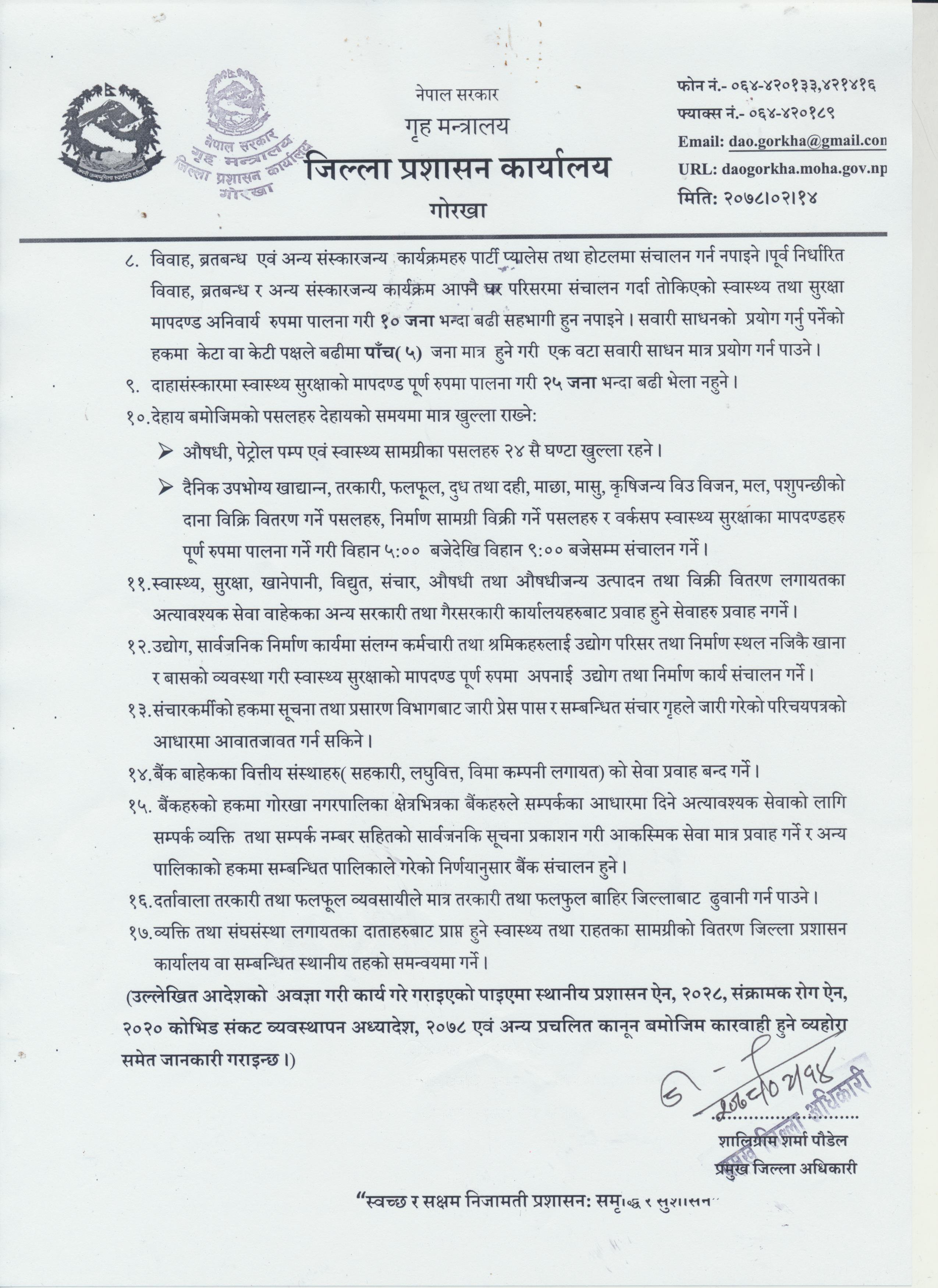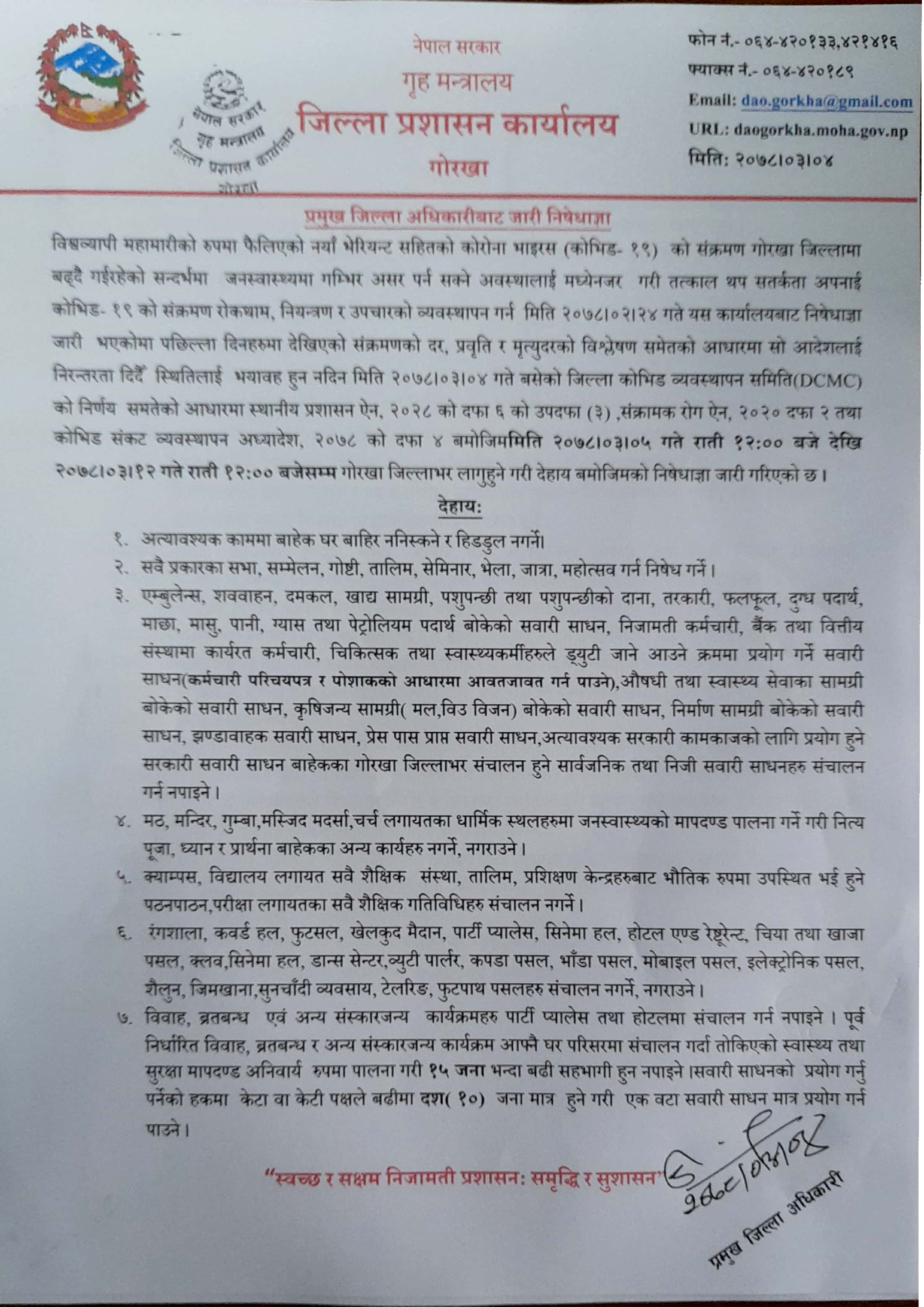 गोरखा जिल्लाका प्रमुख जिल्ला अधिकारीबाट जारी निषेधाज्ञाको आदेश