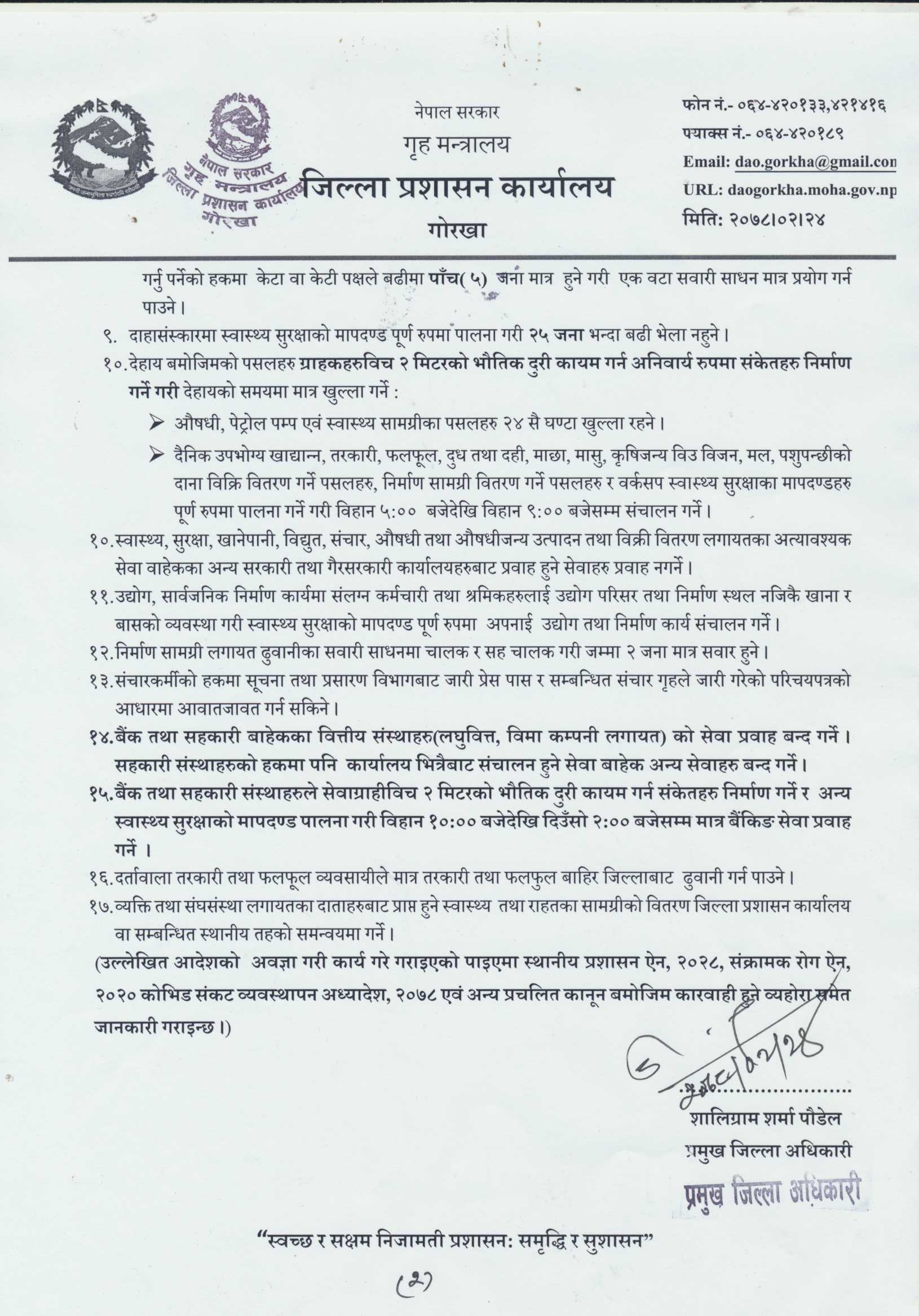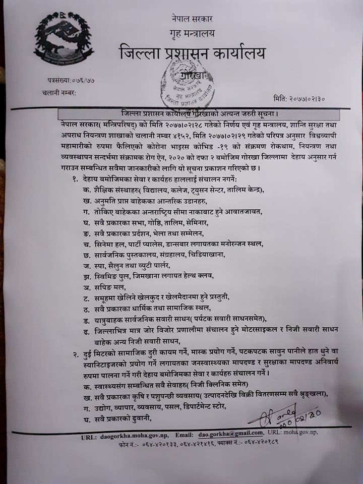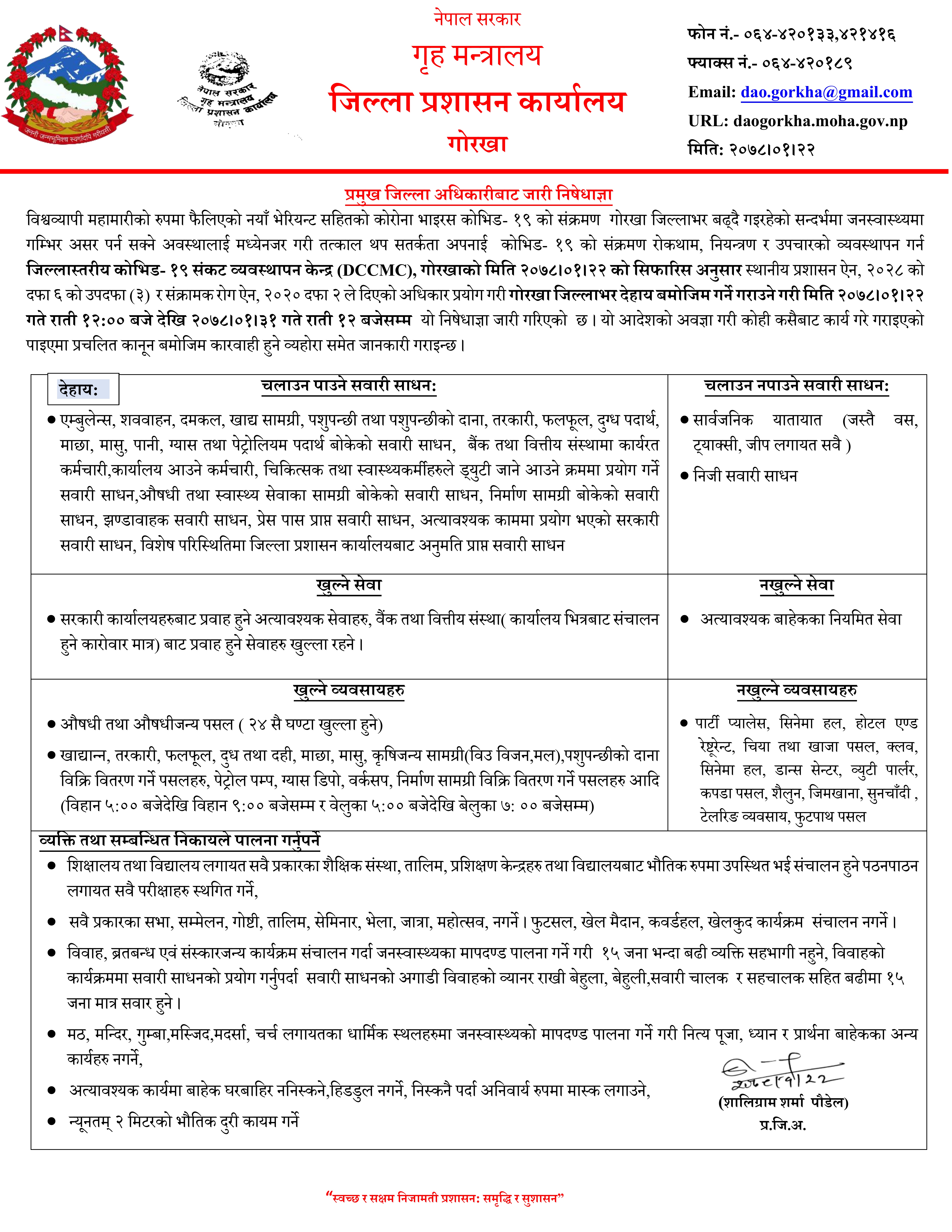 गोरखा जिल्लाका प्रमुख जिल्ला अधिकारीबाट जारी निषेधाज्ञाको आदेश