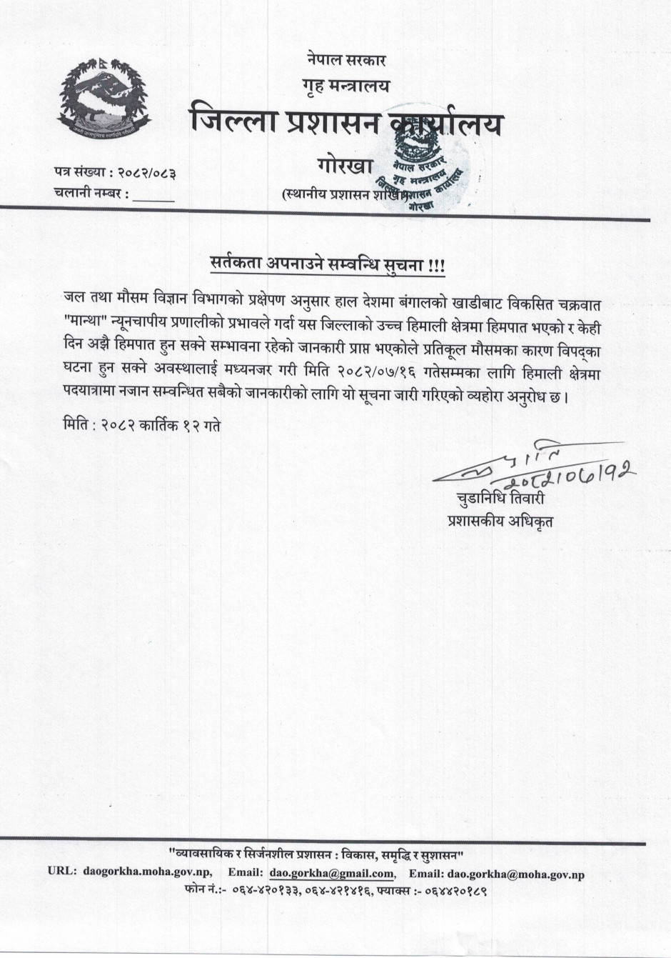 विपद पूर्व सतर्कता अपनाउने सम्वन्धमा जिल्ला प्रशासन कार्यालय, गोरखाबाट जारी भएको जरुरी सूचना !!!