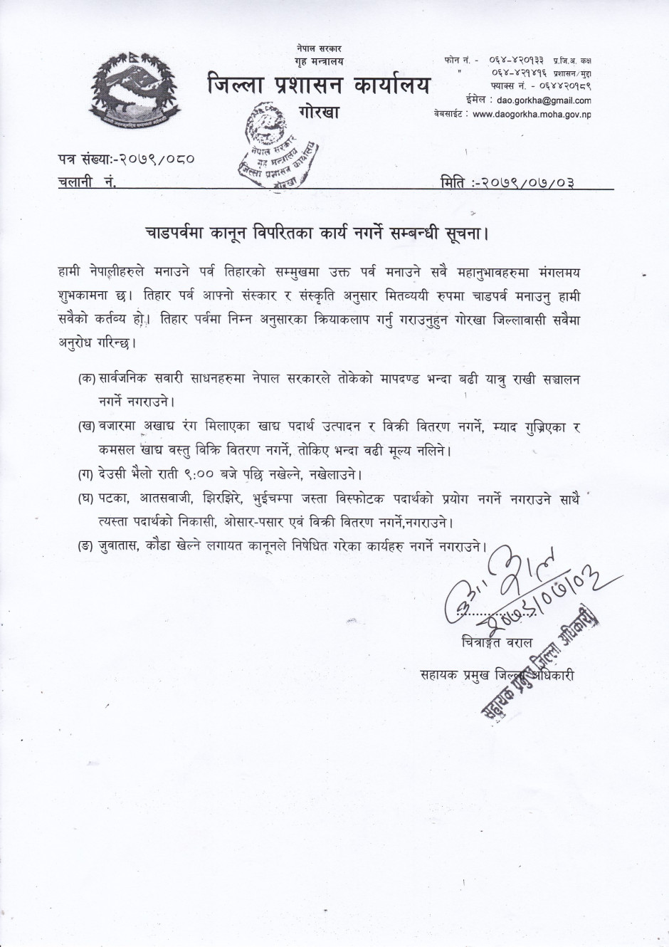 चाडपर्वमा कानून विपरितका कार्य नगर्ने सम्बन्धी सूचना ।