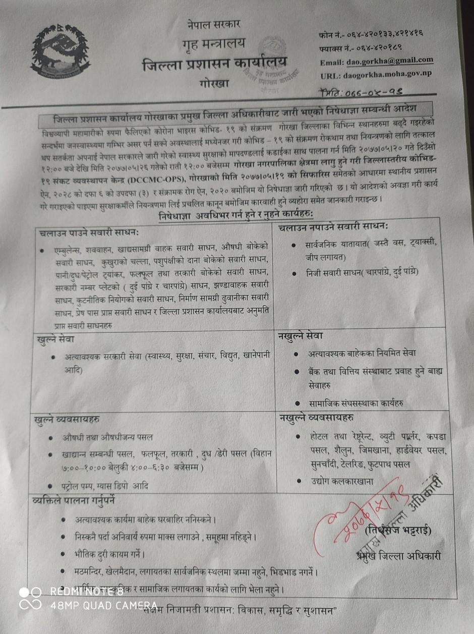 गाेरखा नगरपालिका भर लाग्ने गरी जारीएकाे निषेधाज्ञा