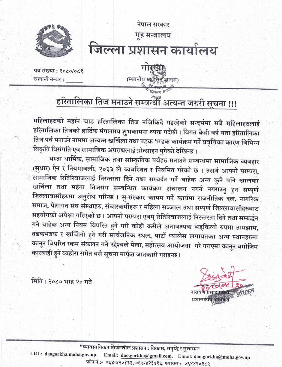 विपद पूर्व सतर्कता अपनाउने सम्वन्धमा जिल्ला प्रशासन कार्यालय, गोरखाबाट जारी भएको जरुरी सूचना !!!