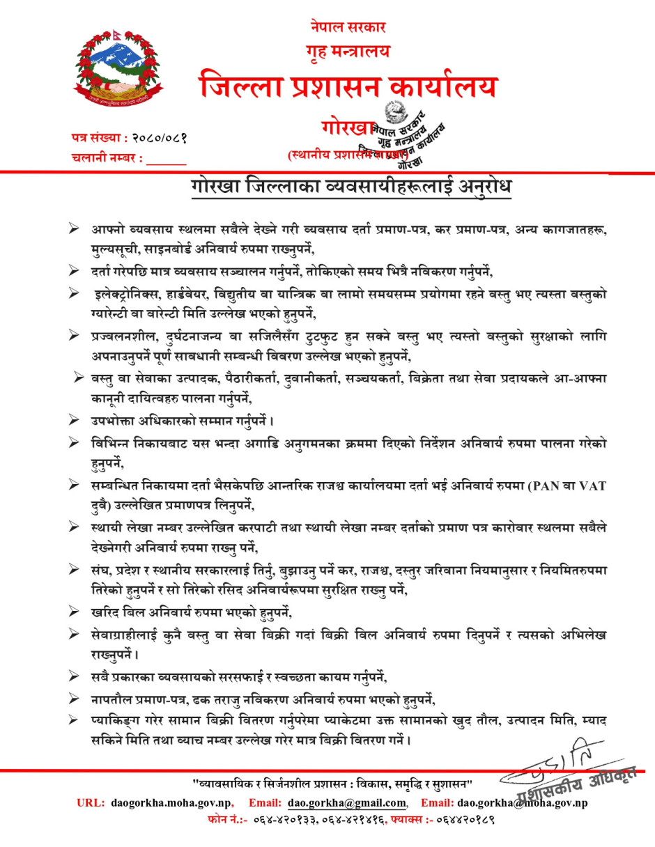 © सर्वाधिकार सुरक्षित जिल्ला प्रशासन कार्यालय, गाेरखा