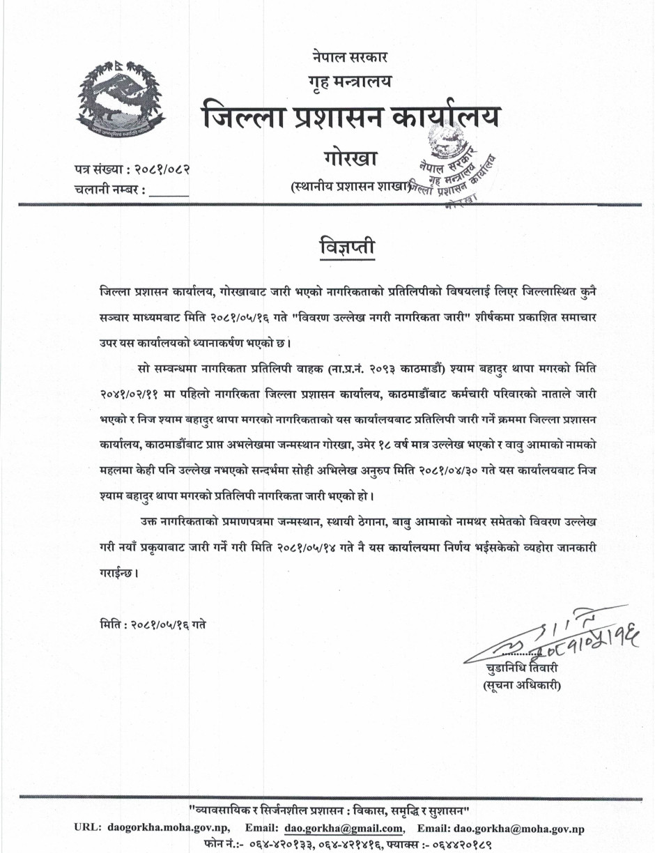 जिल्ला प्रशासन कार्यालय, गोरखाबाट जारी भएको नागरिकताको प्रतिलिपीको विषयलाई लिएर जिल्लास्थित कुनै सञ्चार माध्यमबाट मिति २०८१/०५/१६ गते "विवरण उल्लेख नगरी नागरिकता जारी" शीर्षकमा प्रकाशित समाचार उपर विज्ञप्ति