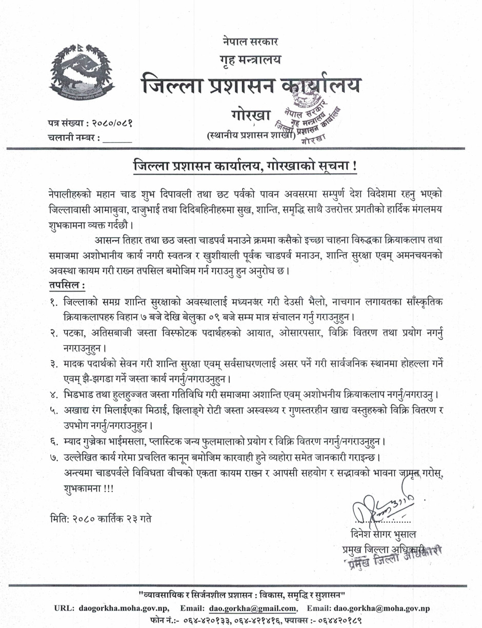 जिल्ला प्रशासन कार्यालय, गोरखाद्वारा चाडपर्व लक्षित सूचना ।