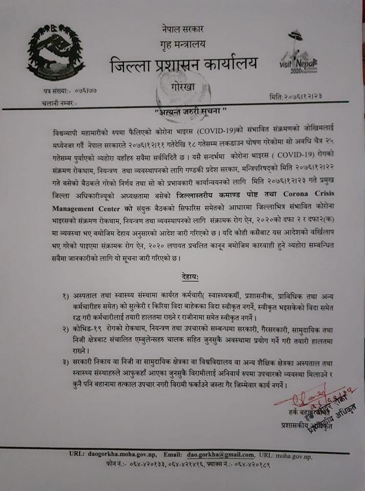 कोरोना भाइरस रोगको रोकथाम, नियन्त्रण तथा व्यवस्थापनको लागि जिल्ला प्रशासन कार्यालयबाट जारी गरिएको आदेश