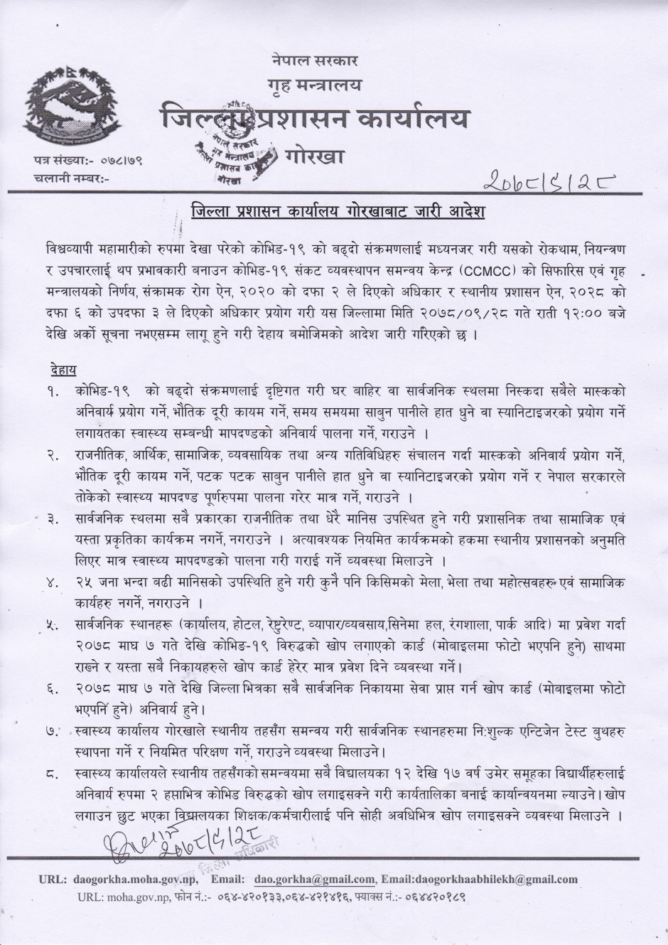 मिति २०७८/०९/२८ गते जिल्ला प्रशासन कार्यालय गोरखाबाट जारी आदेश १