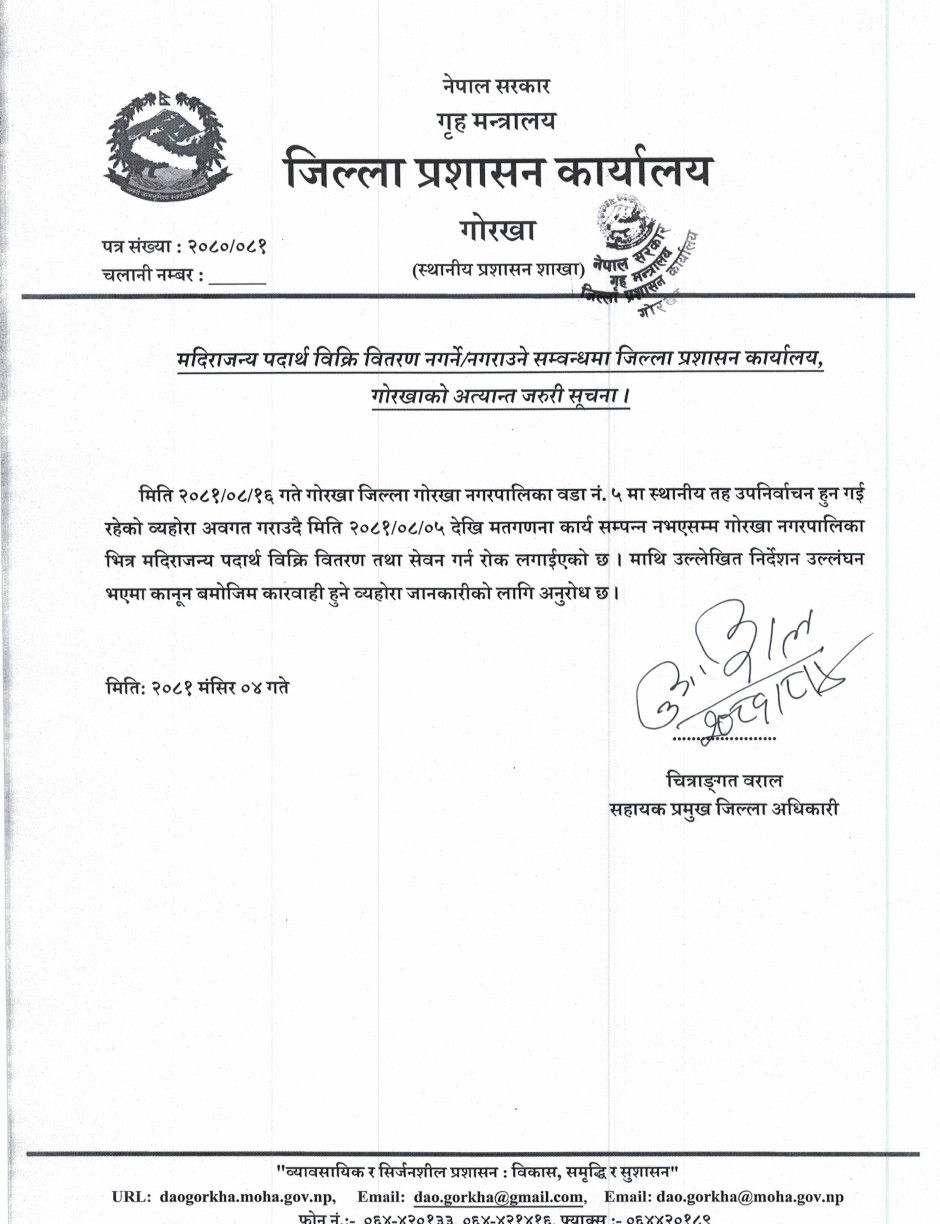 मदिराजन्य पदार्थ विक्रि वितरण नगर्ने/नगराउने सम्वन्धमा जिल्ला प्रशासन कार्यालय, गोरखाको अत्यान्त जरुरी सूचना ।