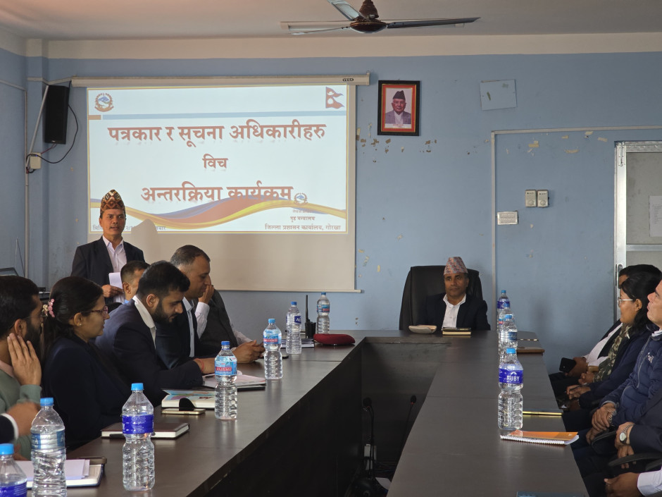 मिति २०८१/१२/१२ गते गोरखा जिल्ला स्थित सरकारी तथा गैर सरकारी कार्यालयहरुमा रहेका सुचना अधिकारी र पत्रकारहरु विच अन्तरक्रिया कार्यक्रम सहित सूचना अधिकारीको बैठक प्रमुख जिल्ला अधिकारी श्री पुण्य विक्रम पौडैलज्यूको अध्यक्षतामा सम्पन्न भएको छ ।