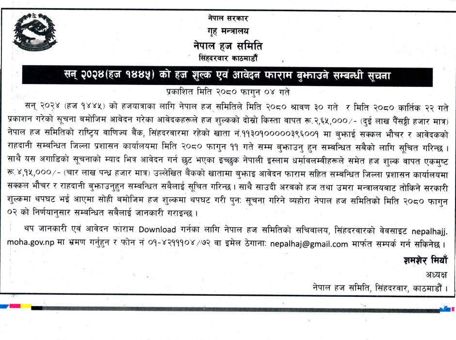 सन् २०२४ (हज १४४५) को हज शुल्क एवं आवेदन फाराम बुझाउने सम्वन्धी सूचना !!!