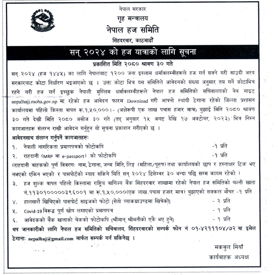 सन् २०२४ को हज यात्राको लागि सूचना ।