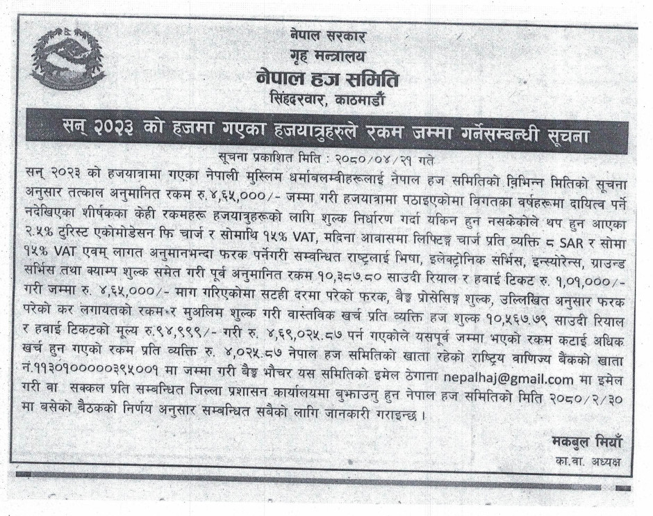 सन् २०२३ को हजमा गएका हजयात्रुहरुले रकम जम्मा गर्ने सम्वन्धी सूचना