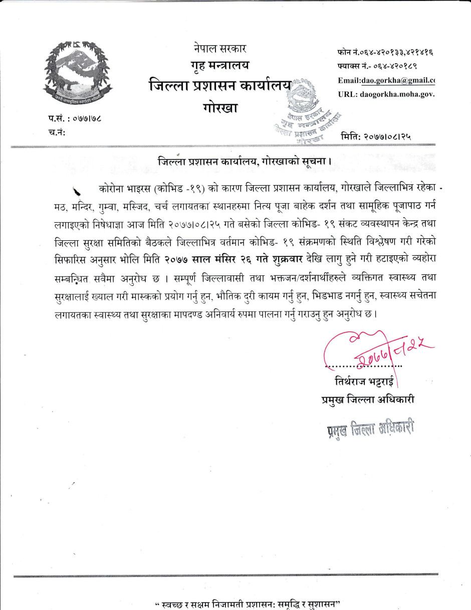 धार्मिक स्थलहरूमा पुजा पाठ खुला गरिएकाे सम्बन्धी सूचना