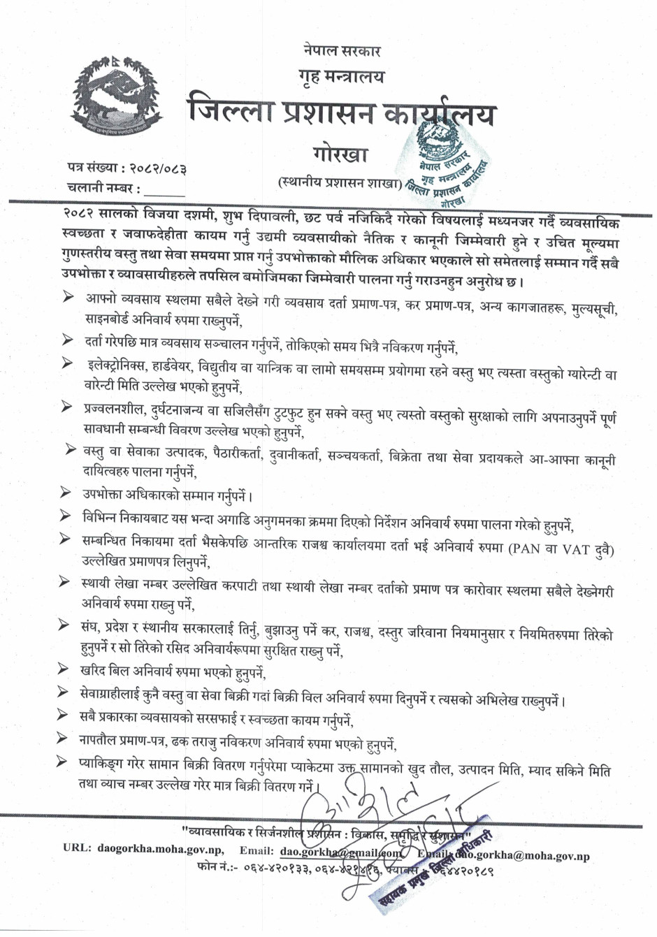 २०८२ सालको विजया दशमी, शुभ दिपावली, छट पर्व नजिकिदै गरेको विषयलाई मध्यनजर गर्दै व्यवसायिक स्वच्छता र जवाफदेहीता कायम गर्नु उद्यमी व्यवसायीको नैतिक र कानूनी जिम्मेवारी हुने र उचित मूल्यमा गुणस्तरीय वस्तु तथा सेवा समयमा प्राप्त गर्नु उपभोक्ताको मौलिक अधिकार भएकाले सो समेतलाई सम्मान गर्दै सबै उपभोक्ता र व्यावसायीहरुले तपसिल बमोजिमका जिम्मेवारी पालना गर्नु गराउनहुन अनुरोध छ ।
