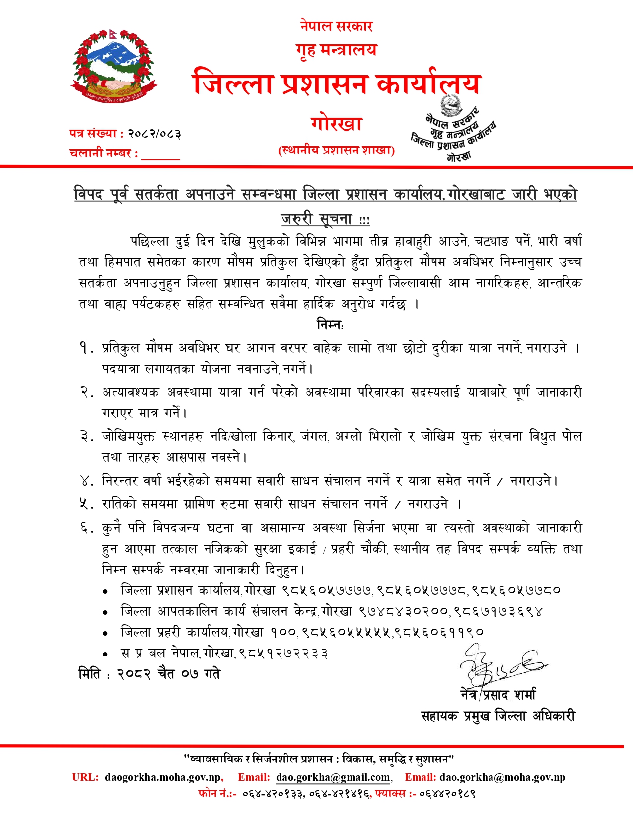 विपद पूर्व सतर्कता अपनाउने सम्वन्धमा जिल्ला प्रशासन कार्यालय, गोरखाबाट जारी भएको जरुरी सूचना !!!