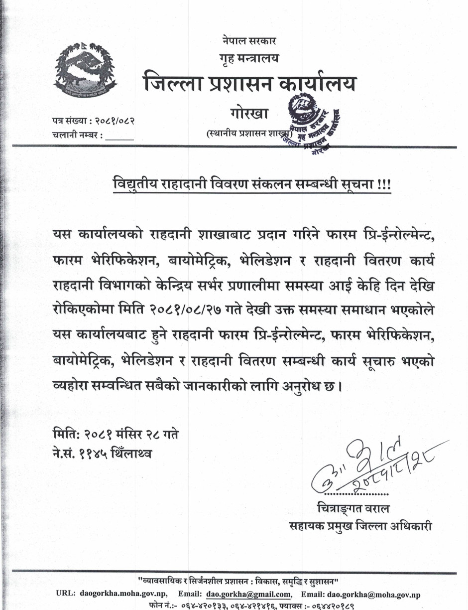 जिल्ला प्रशासन कार्यालयबाट प्रवाह हुने नियमित सेवा वन्द हुने सम्वन्धि सुचना !!!